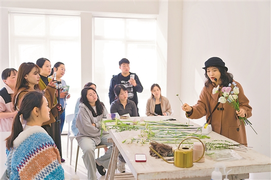 12月8日,在云南昆明某花卉公司,花藝師向?qū)W員講解花束制作方法。