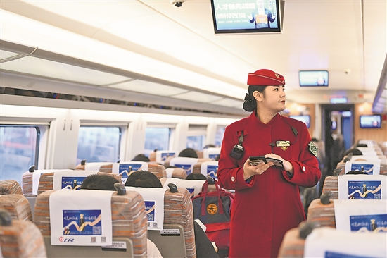 12月10日,京津城際C2002次列車長(zhǎng)白蕊在車廂內(nèi)巡視。當(dāng)日,京津城際實(shí)施新的列車運(yùn)行圖,優(yōu)化京津兩地早晚高峰列車開行方案。新華社記者 李然 攝