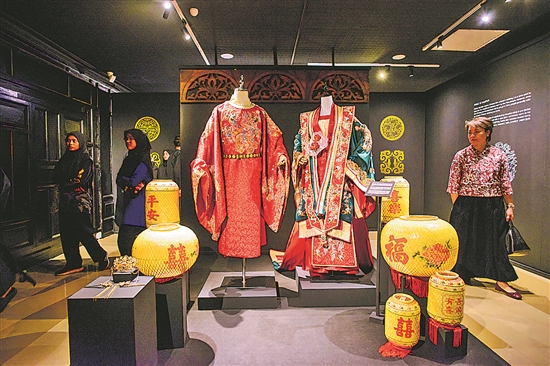 “歷久彌新的漢服與中國紋樣展”近日在馬來亞大學(xué)亞洲藝術(shù)博物館舉辦。作為慶祝中馬建交50周年和馬來亞大學(xué)孔子學(xué)院成立15周年系列活動(dòng)之一,本次展覽由馬來亞大學(xué)孔子學(xué)院主辦,展品涵蓋從秦漢到明代各個(gè)歷史時(shí)期的代表性漢服,呈現(xiàn)出豐富的美學(xué)和文化內(nèi)涵。圖為近日,在馬來西亞吉隆坡,觀眾在展覽現(xiàn)場(chǎng)觀賞展出的漢服。
