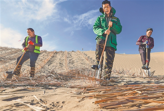 工人在新疆和田地區(qū)民豐縣后河壩沙漠阻擊區(qū)補(bǔ)扎草方格。近日,在新疆于田縣,環(huán)繞塔克拉瑪干沙漠邊緣全長(zhǎng)3046公里的綠色阻沙防護(hù)帶實(shí)現(xiàn)全面鎖邊“合龍”。數(shù)十萬(wàn)人40余載奮斗,終在大漠邊緣筑起一道綠色長(zhǎng)城。新華社記者 王菲 攝
