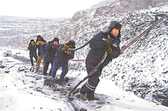 12月11日,氣溫降至零下26攝氏度,中煤華利和翔公司別斯庫都克露天煤礦坑下一級排水管發(fā)生凍堵卡水現(xiàn)象。由于坑下地形復(fù)雜,不適合大型機(jī)械設(shè)備操作,班組職工手拉肩扛,對排水管進(jìn)行了更換和緊急架設(shè)。李磊 孫衛(wèi)東 攝