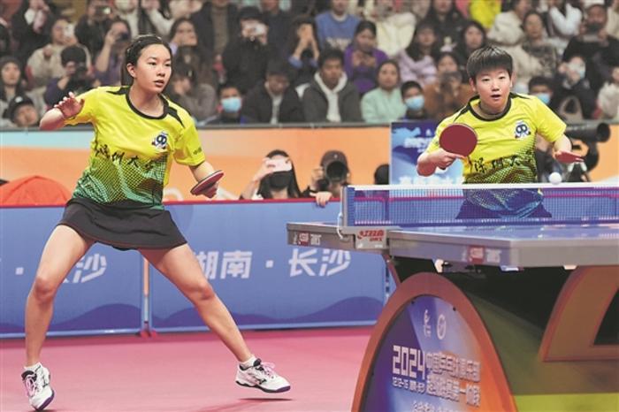 深圳大學隊組合孫穎莎(右)/吳詠琳在女子團體雙打比賽中。新華社記者 薛宇舸 攝