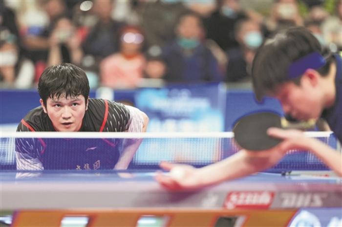 上海地產(chǎn)集團隊選手樊振東(左)在單打比賽中。新華社記者 薛宇舸 攝