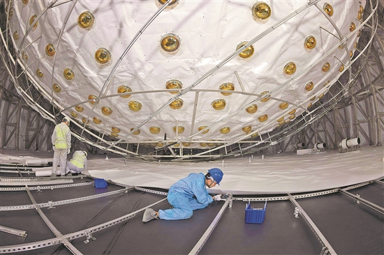 12月16日,工作人員用特衛(wèi)強(qiáng)紙遮蓋水池底部。 12月18日,江門中微子實(shí)驗(yàn)(JUNO)液體灌注啟動,標(biāo)志著該裝置建設(shè)來到最后一個(gè)關(guān)鍵節(jié)點(diǎn)。新華社記者 金立旺 攝
