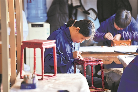 12月18日,河北省廊坊市廣陽區(qū)南漢村,宮廷藝術(shù)小鎮(zhèn)的“燕京八絕”非遺工坊內(nèi),工作人員正在制作雕漆工藝品。