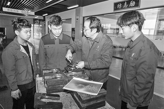 12月16日,位于山東省淄博市淄川區(qū)的山東水利技師學(xué)院智能制造系數(shù)控專業(yè)“勵志坊”內(nèi),老師正在指導(dǎo)學(xué)生加工零部件。