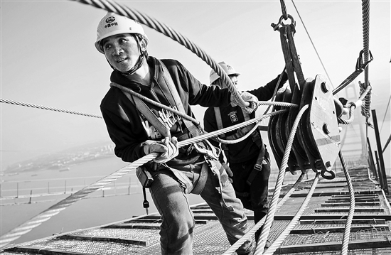 12月16日,在燕磯長江大橋的貓道面網(wǎng)鋪設(shè)施工現(xiàn)場(chǎng),建筑工人在距離江面近200米的高空作業(yè),穩(wěn)步推進(jìn)工程建設(shè)。