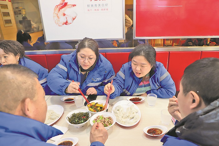 12月20日,吉林省遼源市總工會(huì)啟動(dòng)“冬至送餃子,暖心又暖新”活動(dòng)?;顒?dòng)持續(xù)到2025年1月5日,活動(dòng)期間,該市快遞員、外賣(mài)配送員、網(wǎng)約車(chē)司機(jī)、貨車(chē)司機(jī)等新就業(yè)形態(tài)勞動(dòng)者可持券在市總工會(huì)優(yōu)選的餃子館就餐或打包。圖為勞動(dòng)者在享受優(yōu)惠餐。本報(bào)記者 彭冰 柳姍姍 本報(bào)通訊員 曲思達(dá) 攝