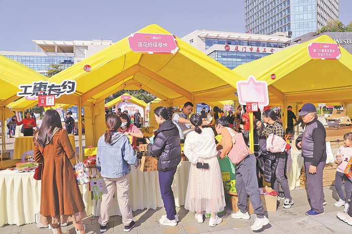 12月21日,由福建省廈門市總工會聯(lián)合多家單位共同舉辦的“雙愛同心 和諧共贏”工會會員服務日活動在廈門市工人文化宮舉行。全總廈門火炬高技術(shù)產(chǎn)業(yè)開發(fā)區(qū)蹲點干部、“雙愛典范”企業(yè)代表、新就業(yè)形態(tài)勞動者、愛心企業(yè)、特惠商戶等600人共赴工“惠”之約。112戶特惠商家入駐集市,為職工提供“衣、食、住、行、游、娛、購”全方位的消費服務。