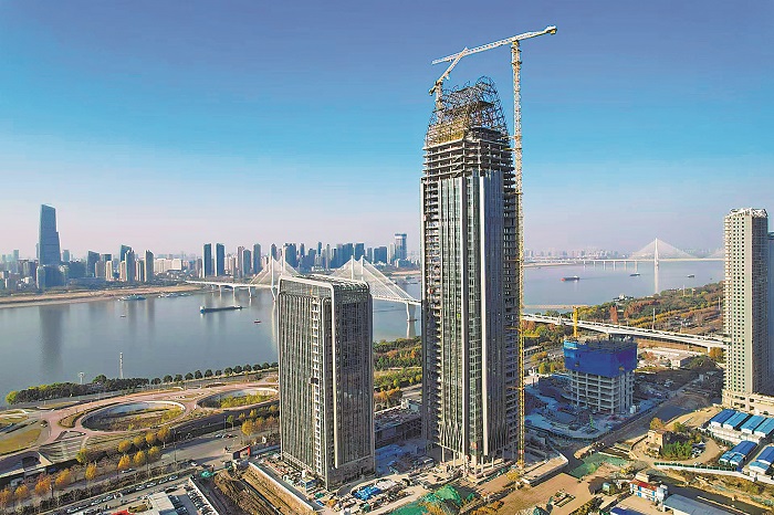 近日,由中鐵建設承建的長江沿岸鐵路集團總部T1塔樓鋼結構塔冠主桁架順利合龍。