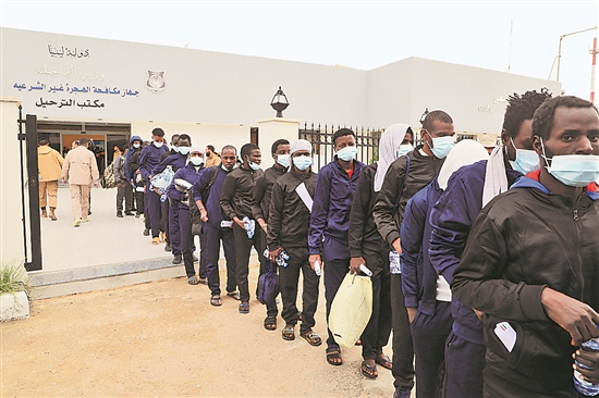 圖為當(dāng)?shù)貢r(shí)間12月25日,在利比亞首都的黎波里,一批非法移民排隊(duì)登上大巴。新華社發(fā)(哈姆扎·圖爾基亞 攝)