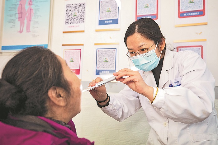 近日,北京市第六醫(yī)院呼吸科門診,醫(yī)生正在為患者檢查。隨著氣溫逐漸下降,目前全國急性呼吸道傳染病呈現(xiàn)持續(xù)上升趨勢。為此,該院加派醫(yī)護(hù)人員,并通過“互聯(lián)網(wǎng)+醫(yī)聯(lián)體”的模式為患者提供服務(wù),以應(yīng)對就診高峰。本報(bào)記者 王偉偉 攝