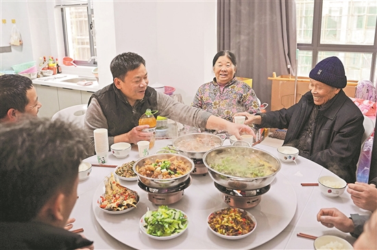 12月26日,在湖南省華容縣團(tuán)洲垸“團(tuán)洲新村”,一戶居民在新家中共進(jìn)午餐。