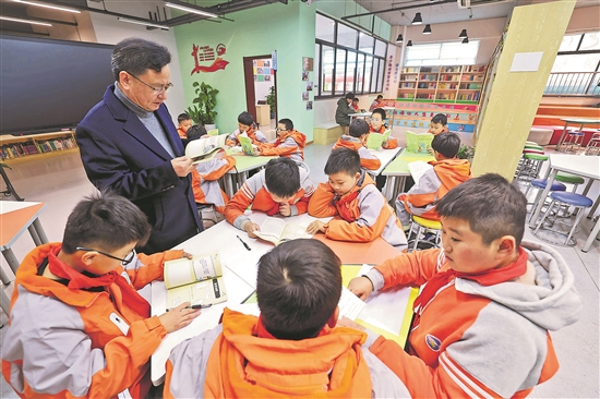 圖為近日在嘉興市南湖區(qū)余新鎮(zhèn)中心小學(xué)圖書館的“老少閱讀攀登合作社圖書漂流站”,退休教師陶坤華與孩子們一起閱讀。