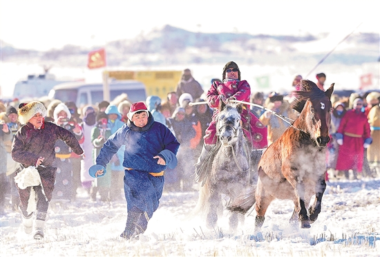 12月28日,參賽選手在馴馬比賽中。當日,2024錫林郭勒冬季蒙古馬超級聯(lián)賽總決賽在內(nèi)蒙古自治區(qū)錫林郭勒盟錫林浩特市白音錫勒牧場開幕?;顒訛槠?天,除設(shè)置賽馬、馴馬、跑馬射箭等比賽項目外,還舉辦豐富多彩的文旅商活動,吸引眾多游客前來觀賞和參與。 新華社發(fā) (王正 攝)