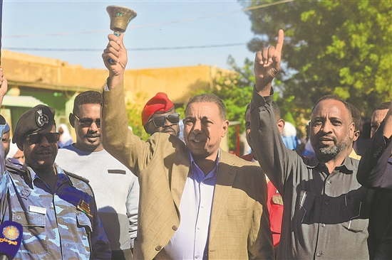 圖為當(dāng)?shù)貢r(shí)間12月28日,在蘇丹北方州棟古拉市一處考點(diǎn),北方州州長(zhǎng)阿卜丁·阿瓦達(dá)拉搖鈴示意證書考試開始。
