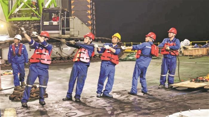 海上風(fēng)電安裝班組工人在牽拉纜風(fēng)繩。劉家暉 李小康 攝
