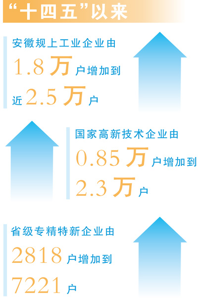 這場從“突圍”到“引領”的征程,沒有奇跡,只有時間和汗水寫下的“爭先進位”答案:“十四五”以來,安徽規(guī)上工業(yè)企業(yè)由1.8萬戶增加到近2.5萬戶,增長近四成;國家高新技術企業(yè)由0.85萬戶增加到2.3萬戶,省級專精特新企業(yè)由2818戶增加到7221戶,其中國家級專精特新“小巨人”企業(yè)690戶。“喬木”參天、“灌木”茁壯、“苗木”蔥郁的企業(yè)生態(tài)初步形成。