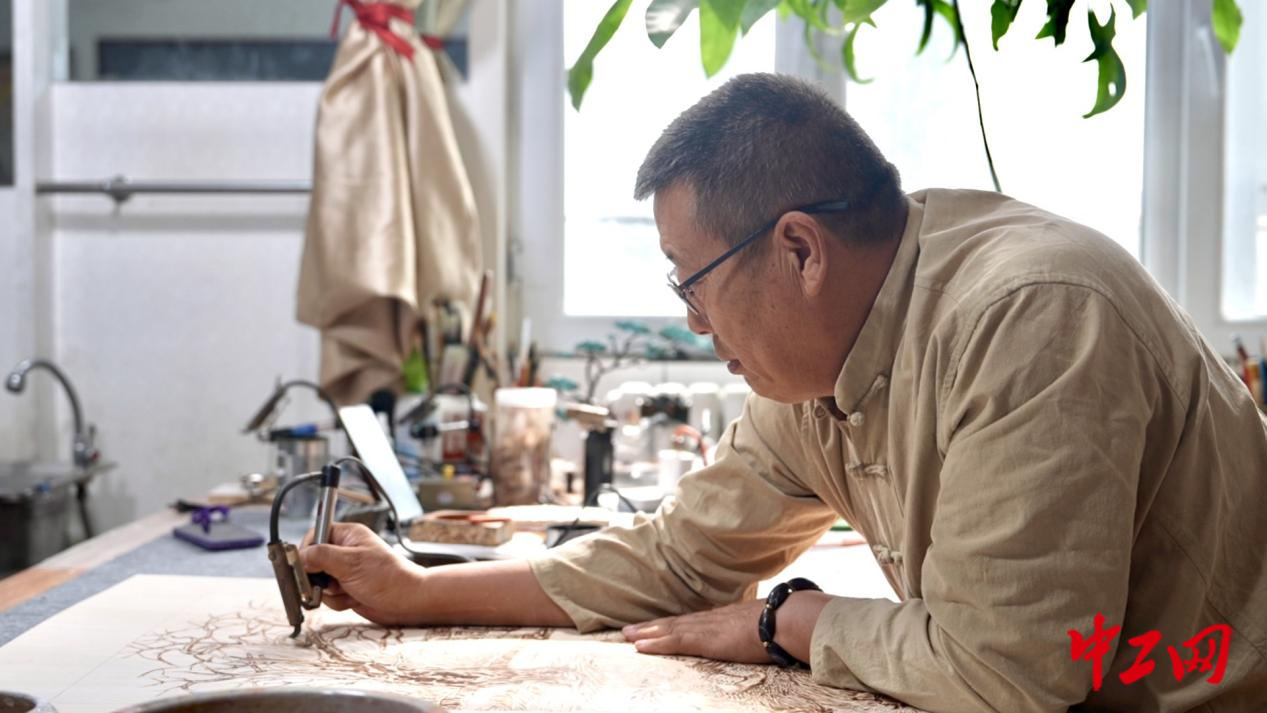 電烙筆筆尖輕觸椴木板,“嗞嗞”聲隨即響起,楊新平全神貫注地操控著筆,木板上,胡楊的輪廓逐漸被勾勒出來(lái)。談及與畫結(jié)緣,他抬頭一笑,一口濃重的“兵普”撲面而來(lái):“從小在兵團(tuán)長(zhǎng)大,后來(lái)偶然見(jiàn)到民間老藝人用火鉤子畫畫,一下就入了迷。說(shuō)到底,還是心里裝著這片土地,想把兵團(tuán)的故事畫出來(lái)?!?/p>