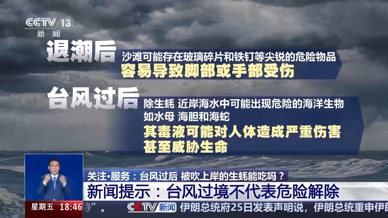 復旦中山廈門醫(yī)院消化內(nèi)科副主任醫(yī)師 翁成釗:臺風過后海灘上的海鮮往往來源不明,它們可能攜帶著如副溶血性弧菌、傷寒桿菌等致病菌,還有可能感染了像諾如病毒、甲肝病毒等病毒,存在著較高的食品安全風險,不建議食用。