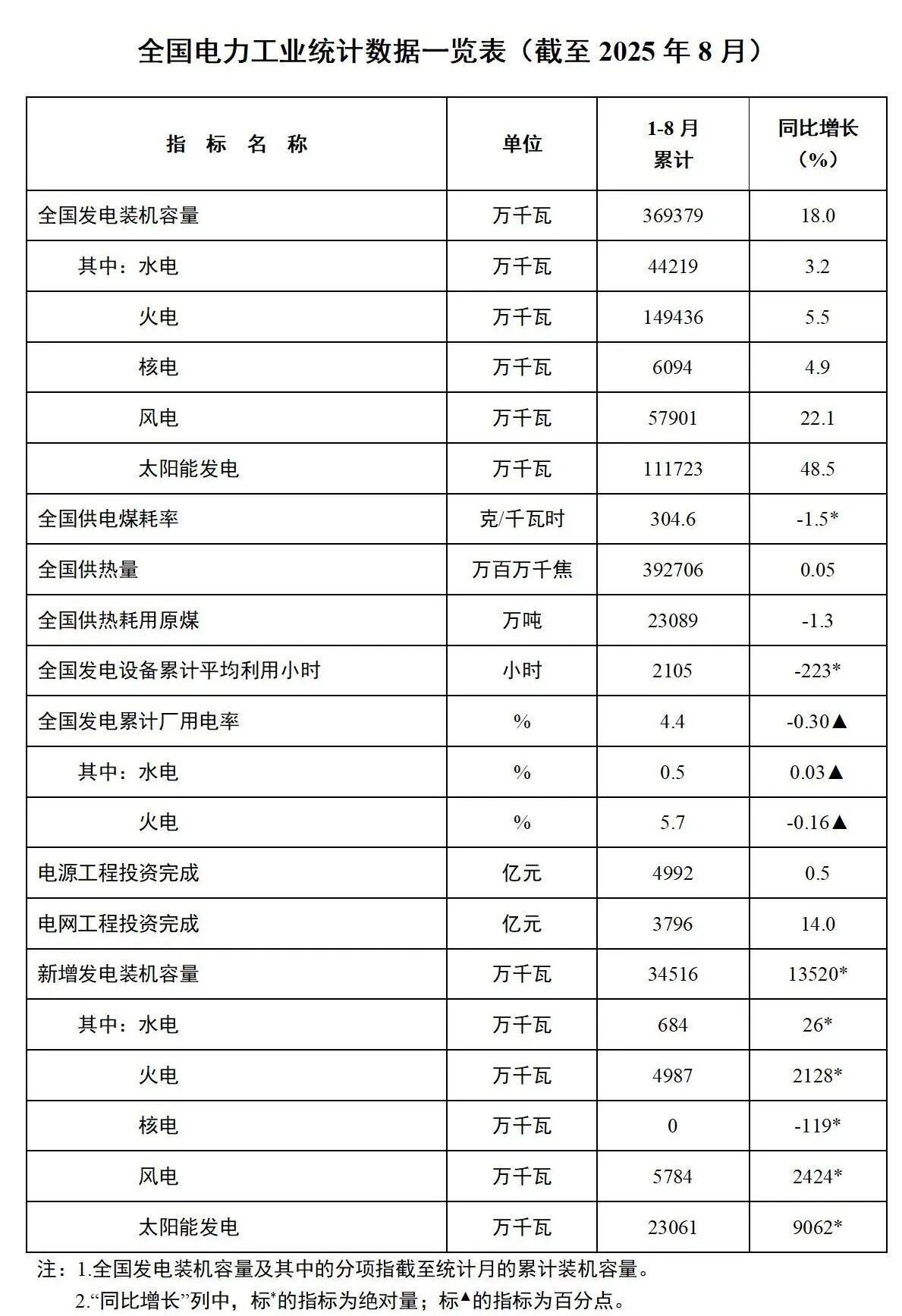 9月26日,國家能源局發(fā)布2025年1~8月份全國電力工業(yè)統(tǒng)計(jì)數(shù)據(jù)。截至8月底,全國累計(jì)發(fā)電裝機(jī)容量36.9億千瓦,同比增長18.0%。